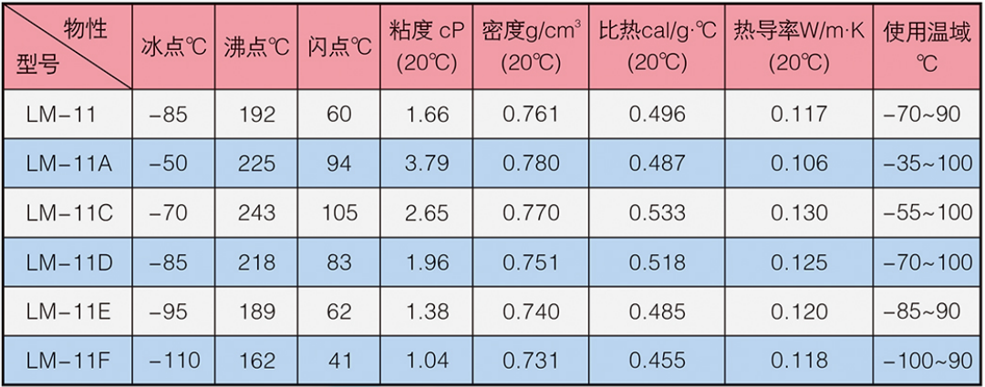 LM-11系列冰河冷媒由高級烷烴改性而成,外觀為淺色液體,不溶于水,低毒,低粘度,化學性質穩定,可燃。