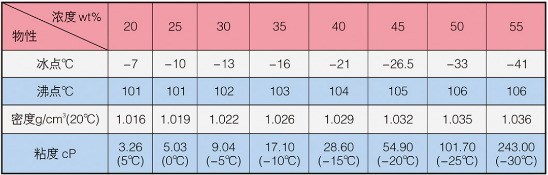 LM-4A型冰河冷媒由改性二元醇構(gòu)成,主要添加劑包括防腐蝕劑,防霉劑,增溶劑、水穩(wěn)劑等。外觀為淺色液體。安全無毒、無異味、不易揮發(fā)。20°C時(shí)密度為1.04g/cm³,比熱為0.56cal/g·°C,粘度為15.9mPa·s(cP),熱導(dǎo)率為0.21W/m·K。沸點(diǎn)高于130°C,冰點(diǎn)低于-50°C,閃點(diǎn)為100°C。