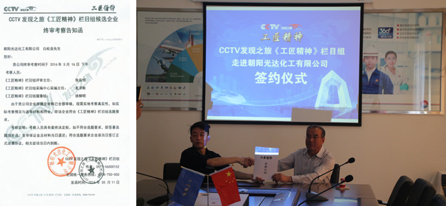 我公司提交的CCTV發(fā)現(xiàn)之旅《工匠精神》資料通過審核,5月11日收到CCTV發(fā)現(xiàn)之旅終審告知函,欄目組于5月17日來我公司進行實地考察并舉行了簽約儀式!