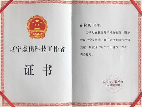 白松泉榮獲“遼寧省杰出科技工作者”榮譽稱號