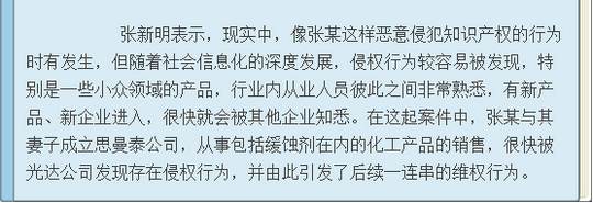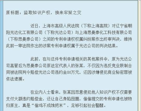 近日,上海市高級人民法院(下稱上海高院)對遼寧省朝陽光達化工有限公司(下稱光達公司)與上海思曼泰化工科技有限公司(下稱思曼泰公司)之間的專利申請權權屬糾紛案作出終審判決,維持此前一審法院作出的涉案專利申請權屬于光達公司的判決結果。在與這件專利申請相關的其他案件中,原為光達公司高管后為思曼泰公司原法定代表人的張某,不僅因為違反競業限制合同被法院判令其賠償光達公司違約金80萬元,還因涉嫌侵犯商業秘密罪被依法逮捕。光達公司不認可法院判決,又在遼寧省朝陽市雙塔區人民法院進行上訴,在2017年8月30日開庭,判決結果如下: