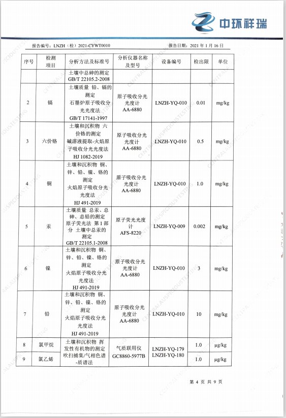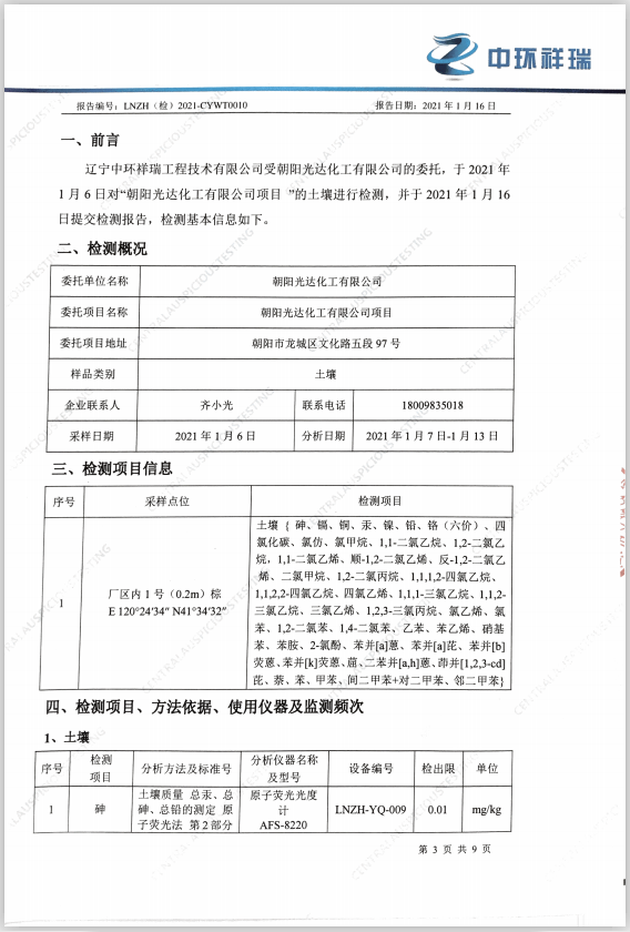 朝陽光達化工有限公司土壤檢測報告公示