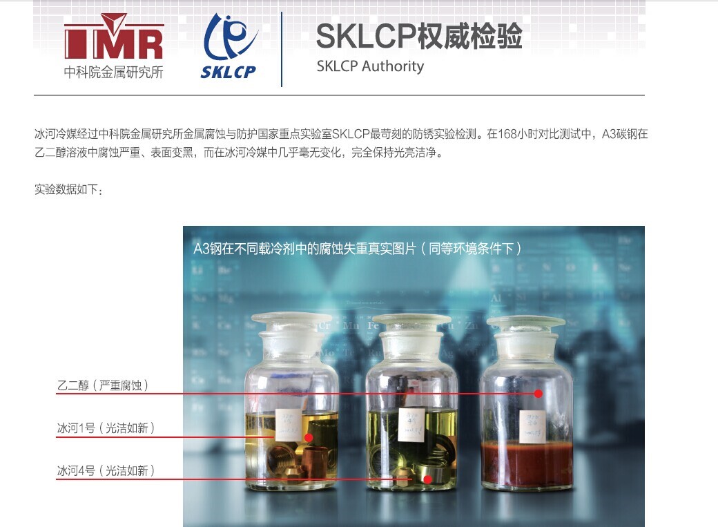 冰河冷媒作為一種新型專業載冷劑,具備“三高、三低、三不”的技術指標,即高沸點、高熱容、高導熱系數,低冰點、低粘度、低毒性,以及不燃不爆、不腐蝕、不污染環境。它采用M3超膜防銹技術、Modify2000復合改性技術和Box7全能測試三大核心技術,有效防止金屬腐蝕,提升系統性能。